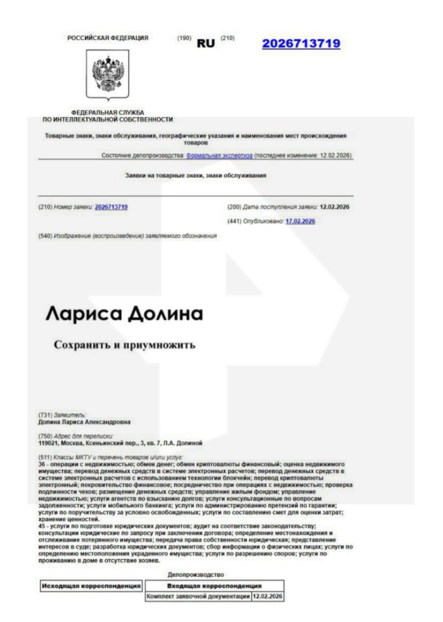 Ранее в сети появилась информация о заявке на регистрацию товарного знака, поданной якобы от имени Ларисы Долиной. Эта заявка касалась деятельности компании, планирующей заниматься сделками с недвижимостью и финансовыми операциями с криптовалютой. Пудовкин призвал общественность не спекулировать на этой теме и быть внимательными к подобным сообщениям.
